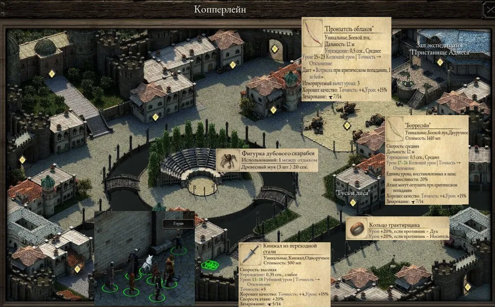 На этой локации есть два неплохих лука: один можно выкупить у рыночного торговца за немалые деньги, второй — получить за выполнение главного квеста в «Пристанище Адмеса» (либо снять с трупа). Для покупки хорошего снаряжения нужно очень много золота, да и замок необходимо отстраивать, поэтому увеличивайте команду. Полезно посетить Дар Ондры, выкупить у местных торговцев снаряжение (или взять его на заметку)