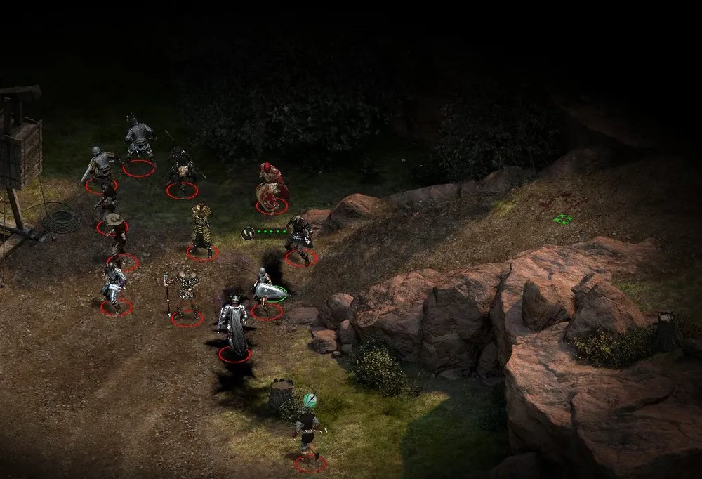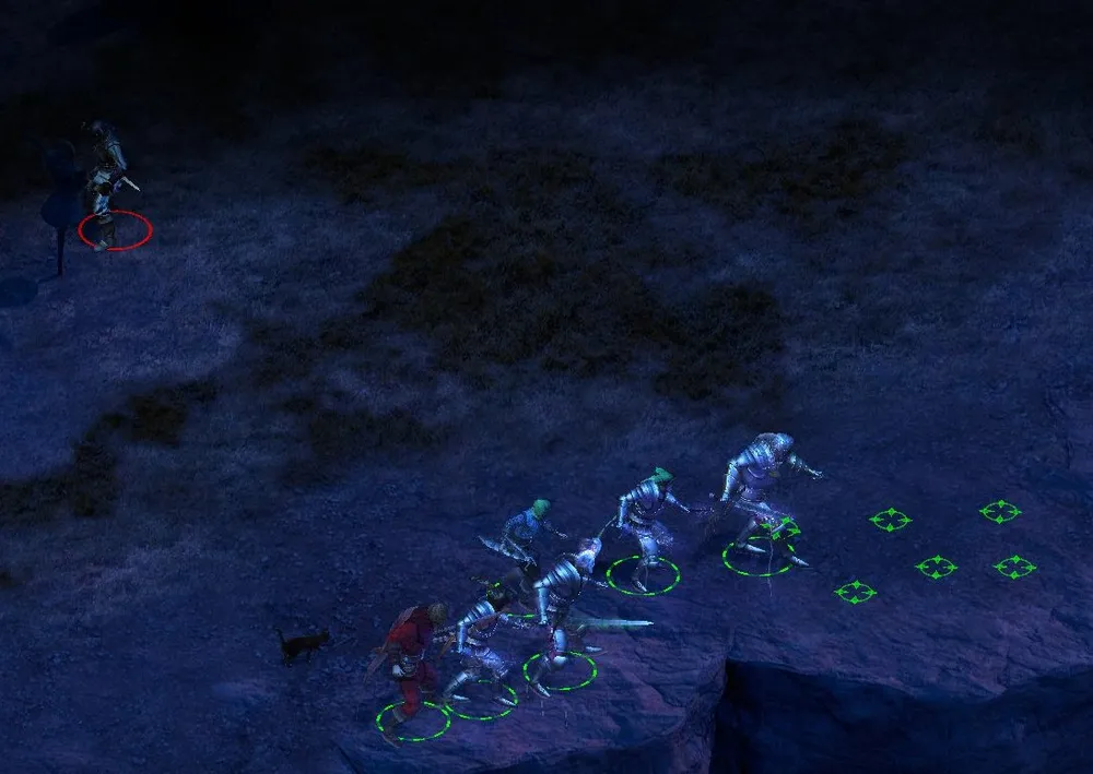 Через пещеру не пробраться, идём верхом, но не по первой, а по второй, более дальней дороге. Как только заметят – скрытие в тени и бегом вверх до места, где можно выйти из боя и восстановить режим разведки. Вдоль края обрыва продвигаемся вперёд, но нас всё равно заметят: в тень не уходим, бежим к нейтральному отряду предводителя! Состоится разговор, который в любом случае закончится нападением врагов: уходим в тень, у заграждения поворачиваем вверх и, если нас не заметили, отдыхаем.