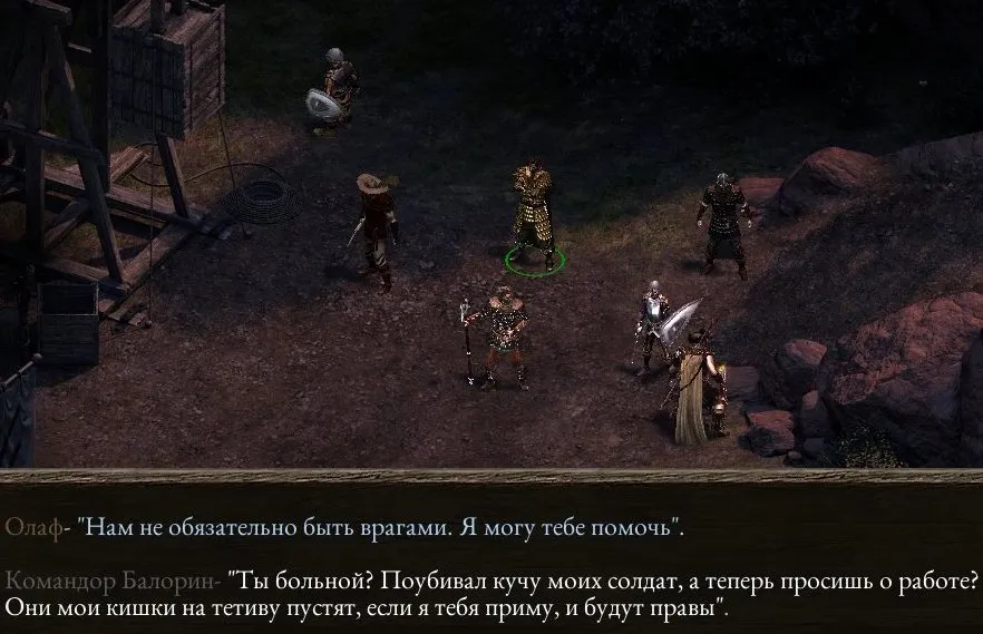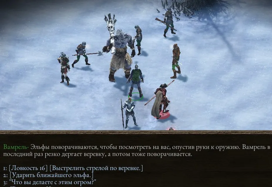 А вот с огром, взятым в плен эльфами, разговор не состоялся: даже не смотря на то, что его путы перерезал герой метко пущенной стрелой. (К слову, фраза со стрелой появляется, только если в руках у героя лук.)