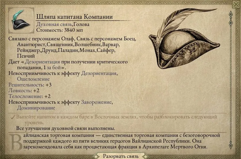 Оказалось, нужно подойти к первому попавшемуся торговцу и поменять характеристики в пользу шляпы. Последнее её требование было и вовсе чудным: выпить в каждом трактире. (Всего их восемь: один в Позолоченной Долине, два в Даре Ондры (маяк и «дом свиданий»), по одному в Брэкенбури, Копперлейне и Деревне Дирфорда; ещё два: на рынке Хартсонга и Небесных Саженцах.