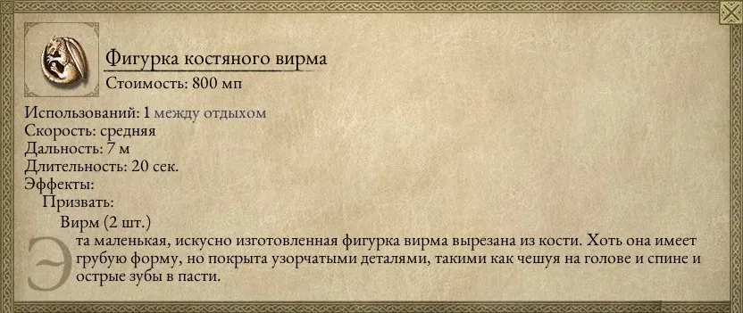 «Фигурка костяного вирма» призывает пару одноимённых летучих созданий, обладающих дистанционной атакой: не очень здорово, но для задержки врага годится.