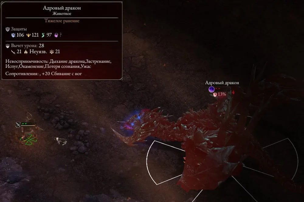 Уничтожил, добрался до спуска, и… Я так и знал – дракон (благодаря уровню игры в его свите всего лишь два ксаурипа, но и этого хватает). Ближний бой – ему достаточно одного удара или выдоха пламени. Значит, лук. Призываю союзников, чтобы тормозили огнедышащую тварь и осыпаю его стрелами, постепенно отбегая. Довёл до состояния «Тяжёлое ранение» и погиб, зато узнал, от чего защищена ящерица-переросток. Сбегал наверх, усилил лук разъедающим уроном, добавил бонус к атаке по животным.