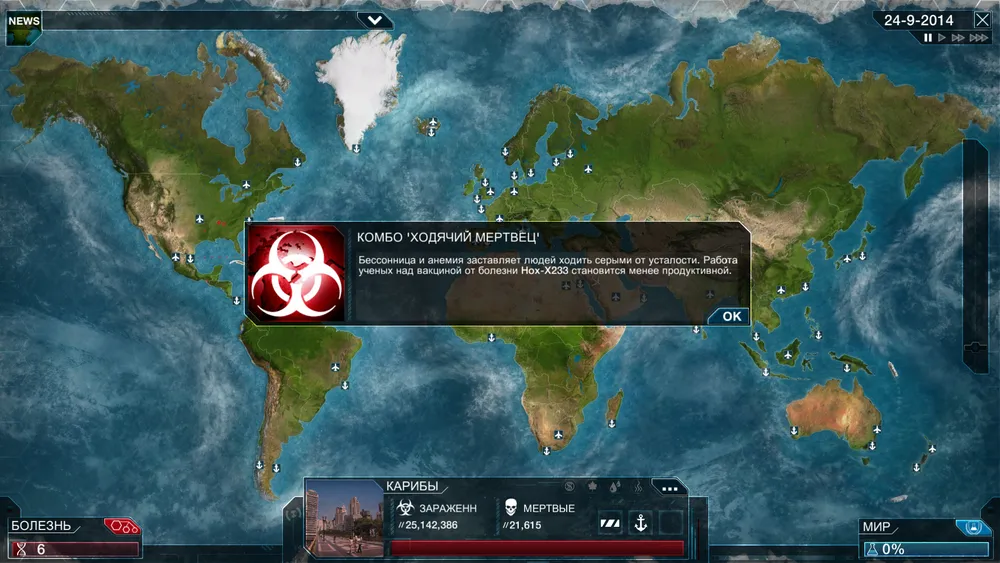 И еще одна болезнь, добавленная бонусом веселья ради. Это мой личный любимчик, и сейчас вы поймете почему. Зомби. Да-да, благодаря этой заразе можно поднимать покойников из могил, управлять их ордами, континентальными передвижениями трупов, и превратить всех животных в переносчиков-вампиров. Я уже прямо вижу, как загорелись ваши глаза…Сложность данного режима только в том, что человечество начнет создавать подразделения «Z COM», которые будут зачищать завоеванные зомби территории, пока их самих кто-нибудь не съест, или они не заразятся. Кстати, зомбей лечить невозможно, чай не сериал «Во плоти», а значит все потуги людей создать панацею от болезни пойдут прахом.