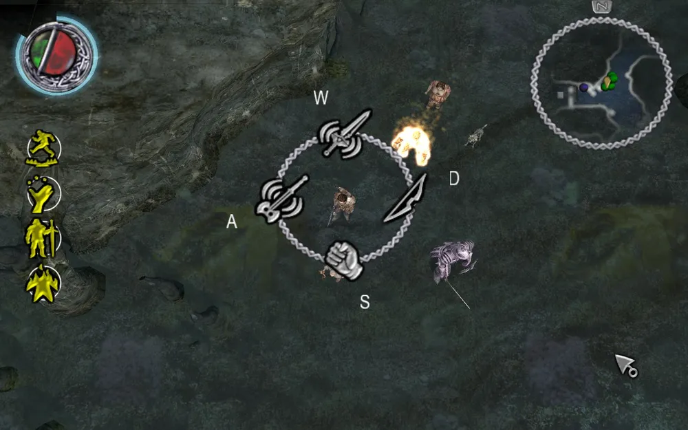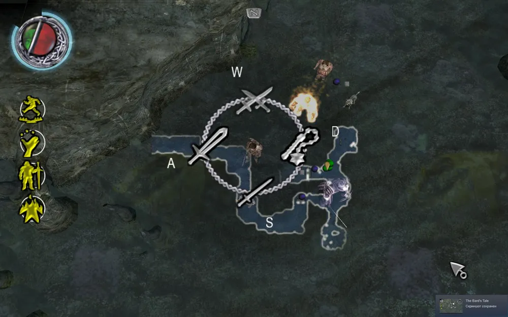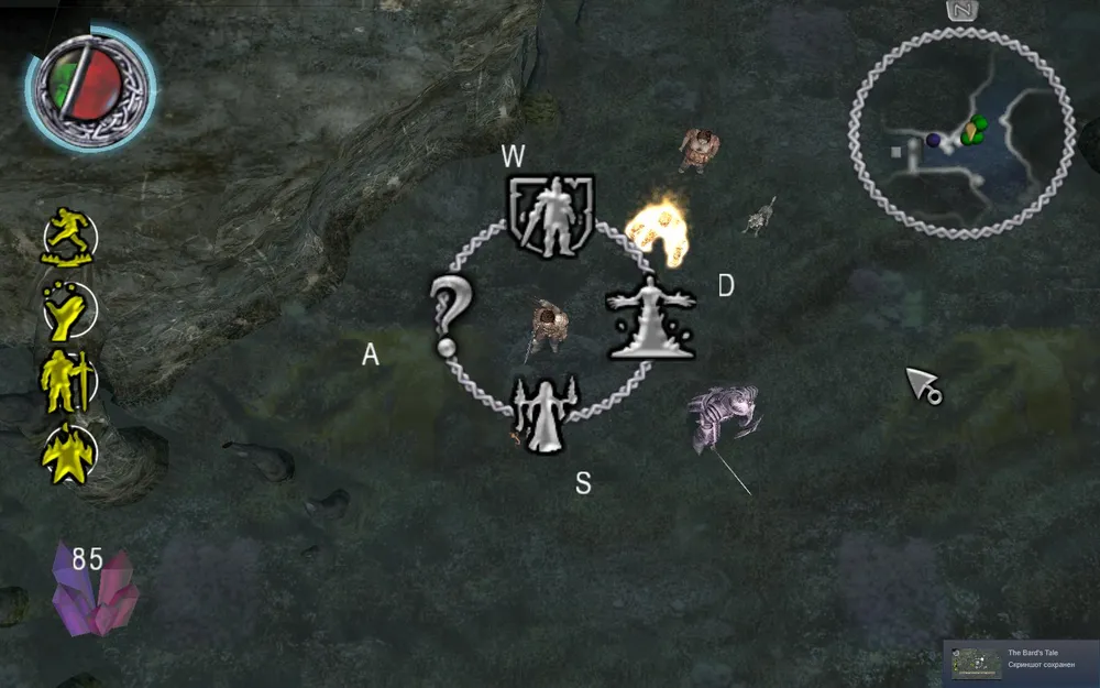 Также разработчики переиначили управление The Bard's Tale необычным образом. Правая кнопка мыши указывает барду, куда идти по местоположению курсора, левая отвечает за совершение атаки оружием. Цифры 1, 2, 3, 4 используются для вызова меню по его выбору, волшебной мелодии или магии с помощью грозового кристалла. Затем с помощью клавиш W, A, S, D оттуда выбирается конкретный элемент. Элементы меню расположены крестообразно. Например: 1 - D - это последовательность команд для выбора оружия (лука).