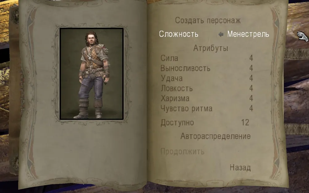 При запуске новой игры предлагается настроить главного героя как и в других RPG. Но здесь нельзя поменять класс или внешность персонажа - это будет в любом случае бард. В зависимости от уровня сложности игроку предстоит решить как распорядиться доступным количеством очков и распределить характеристики барда: