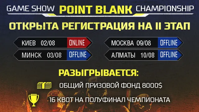 GSL.TV при поддержке игровой платформы 4game сообщают о заключении квалификационного онлайн этапа Game Show Point Blank Championship, по итогам которого определились 15 команд, получившие преимущество на оффлайн этапе. Украина, Беларусь, Россия и Казахстан готовы принять в своих стенах команды. Победа на ивенте даст возможность игрокам продолжить бороться за своё место на DreamHack Moscow, который состоится 13-14 сентября в Stadium Live, Москва.