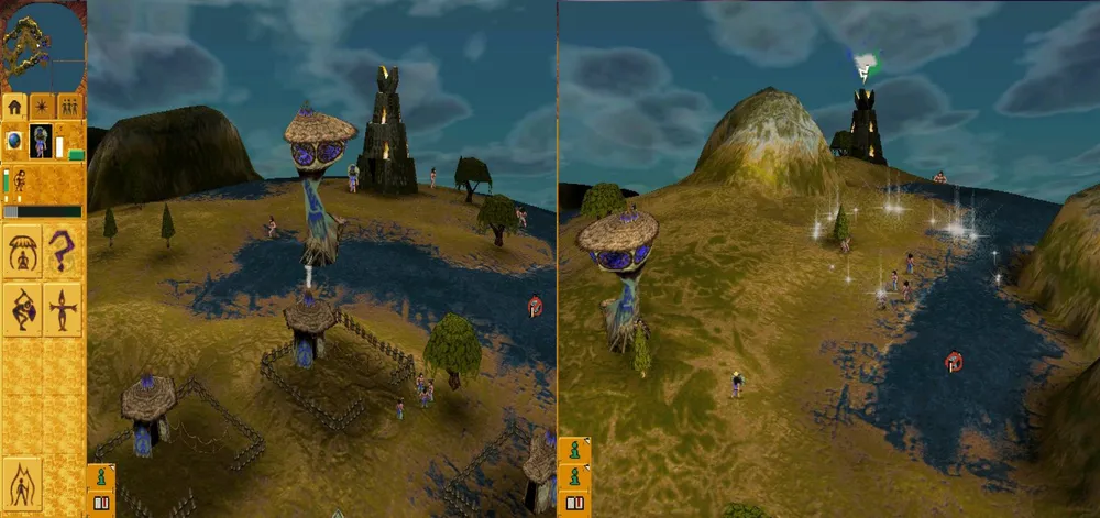 Оставляем в каждой хижине по паре рабочих – для прироста населения, а остальных отправляем к ближайшей каменной голове – молиться. И получаем первое заклинание терраформирования: «Земляной мост». Причём возобновляемый до тех пор, пока перед его источником будут возноситься молитвы.
