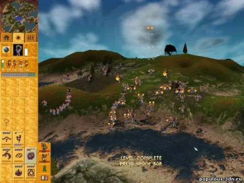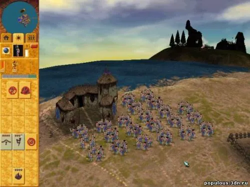 Populous: The Beginning оказалась третьей по счету в серии стратегией в реальном времени, сочетающей в себе, говоря с некоторым преувеличением, и RTS, и стратегию непрямого контроля, и симулятор бога одновременно. При начале игры, в вашем подчинении оказывается один основной персонаж – это шаман одного из древних человеческих племен. И шаман этот не обделен магией, за что, как правило, все вокруг ему поклоняются, кроме, разве что, совсем уж невежественных дикарей, коих следует просвещать о своем могуществе, с помощью верных своих проповедников. А уж, будучи вашими поклонниками - одновременно вашими же подопечными – люди сделают все, что только вы им прикажете. И хату построят, и храм, и бараки, и на войну с другими племенами за вас пойдут! А как же, не будь в игре вражеских племен – нахалов, поклоняющихся совсем другим, не правильным шаманам – не было бы у нас и игры… Впрочем, и без того управлять своим небольшим, но старательным племенем очень даже интересно. Все те, кому приказов вы не раздаете – будут жить поживать своей личной жизнью. Тем отрадней, что большинство ваших подданных – верные, убежденные трудоголики! Если у соседа дом не достроен – половина поселения тут же примчится, безо всякого прямого приказа, достраивать общественно важное строение. И свои излишки ресурсов прихватят! Ну а, если уж так случилось, что нет никаких срочных дел – поклонники пойдут вытанцовывать в честь шамана и вокруг шамана, чудные доисторические хороводы.