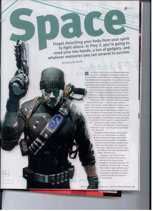 Превью игры Prey 2 рассказывает о Киллиане Сэмуэлсе, наемнике, ставшем охотником за головами на инопланетной планете Исход. Игрокам предстоит преодолевать открытый мир с помощью паркура и укрытий, чтобы поймать пришельцев, используя различные тактики и стратегии. Игра обещает захватывающие погони и динамичные перестрелки в стилистике культового фильма 'Бегущий по лезвию'.