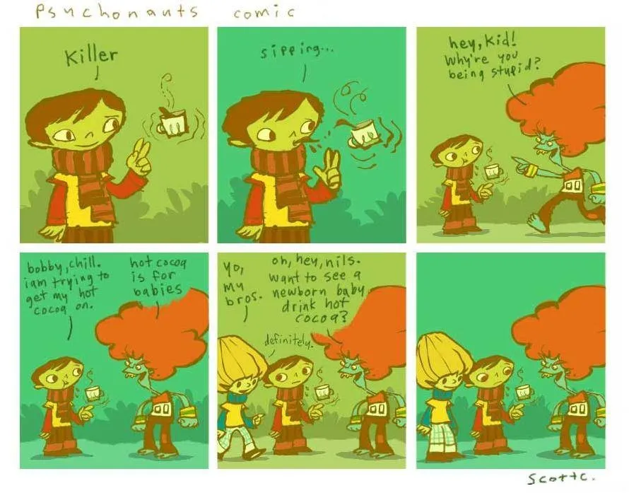 Обзор комиксов по теме Psychonauts, включая персонажей Бобби Зилча, Агента Найн и уборщика Круллера, а также истории о Милле, Саше Найн и обеде в лагере Шепчущей Скалы.