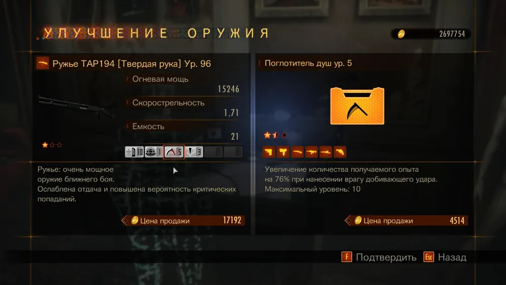 Мастер ружья и снайперской винтовки. Для каждого типа оружия свои навыки, но дают они одно и то же, а именно увеличивают общее количество переносимых патронов на 369% и повышают скорость перезарядки на 120% (при максимальной прокачке). В первую очередь стоит до предела улучшить «мастера ружья», поскольку именно этот тип оружия, по моему мнению, — самое эффективное средство уничтожения противника, а при наличии большого боезапаса мы сможем поставить насадку, позволяющую стрелять дуплетом.