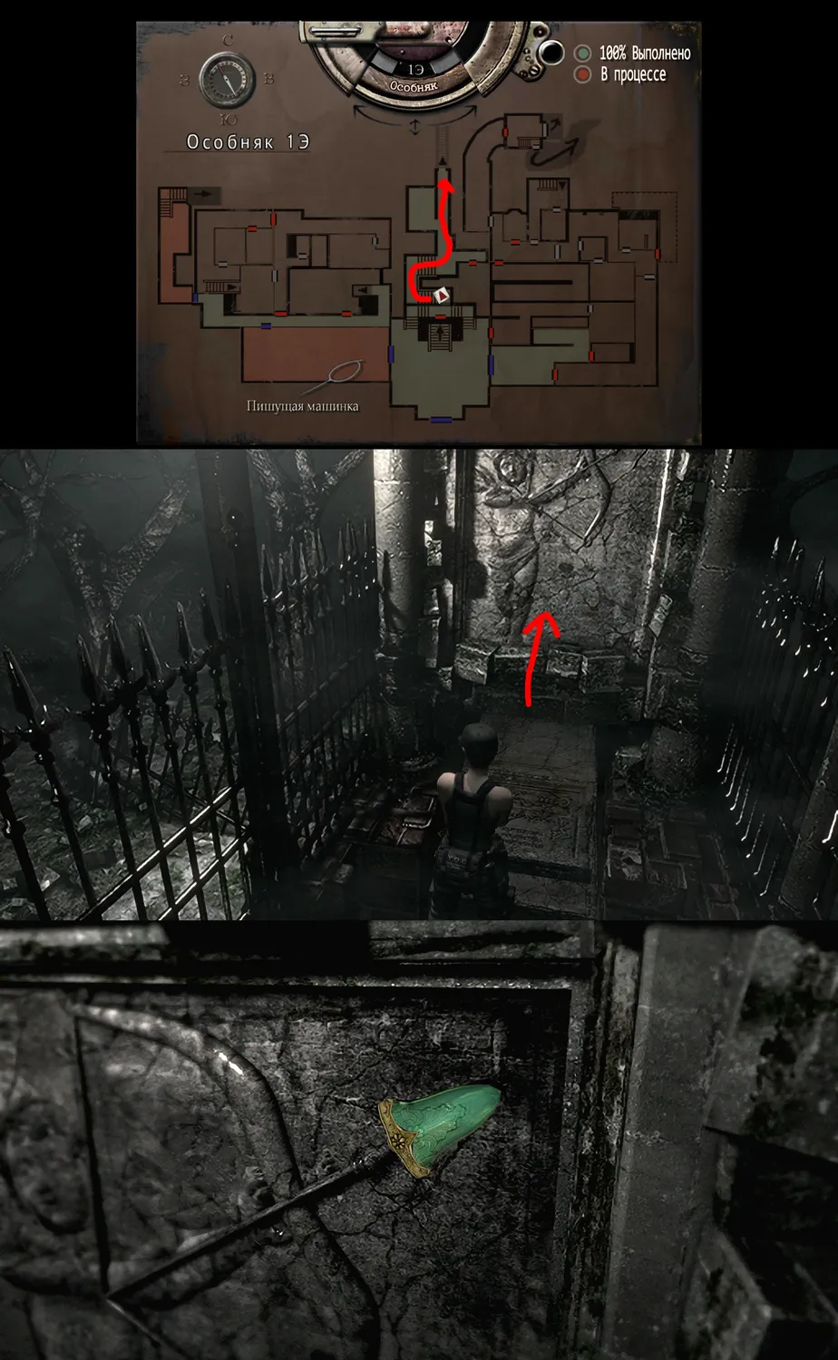 Для начала добудем карту первого этажа, чтобы нам было проще ориентироваться. Идем в единственную открытую дверь восточного (правого) крыла на пером этаже и попадаем в галерею странных фотографий, где по центру стоит каменная баба с кувшином. В кувшине что-то сверкает. Это и есть наша карта. Обходим бабу и видим шкаф, что плотно стоит у стены. Забираемся на него и перелезаем на другую сторону (клавишами «Действие»). Оказавшись в маленьком проходе, мы просто двигаемся в сторону шкафа и Джилл начнет его двигать к статуе. Когда шкаф будет достаточно близко – забираемся на него и берем карту из кувшина.