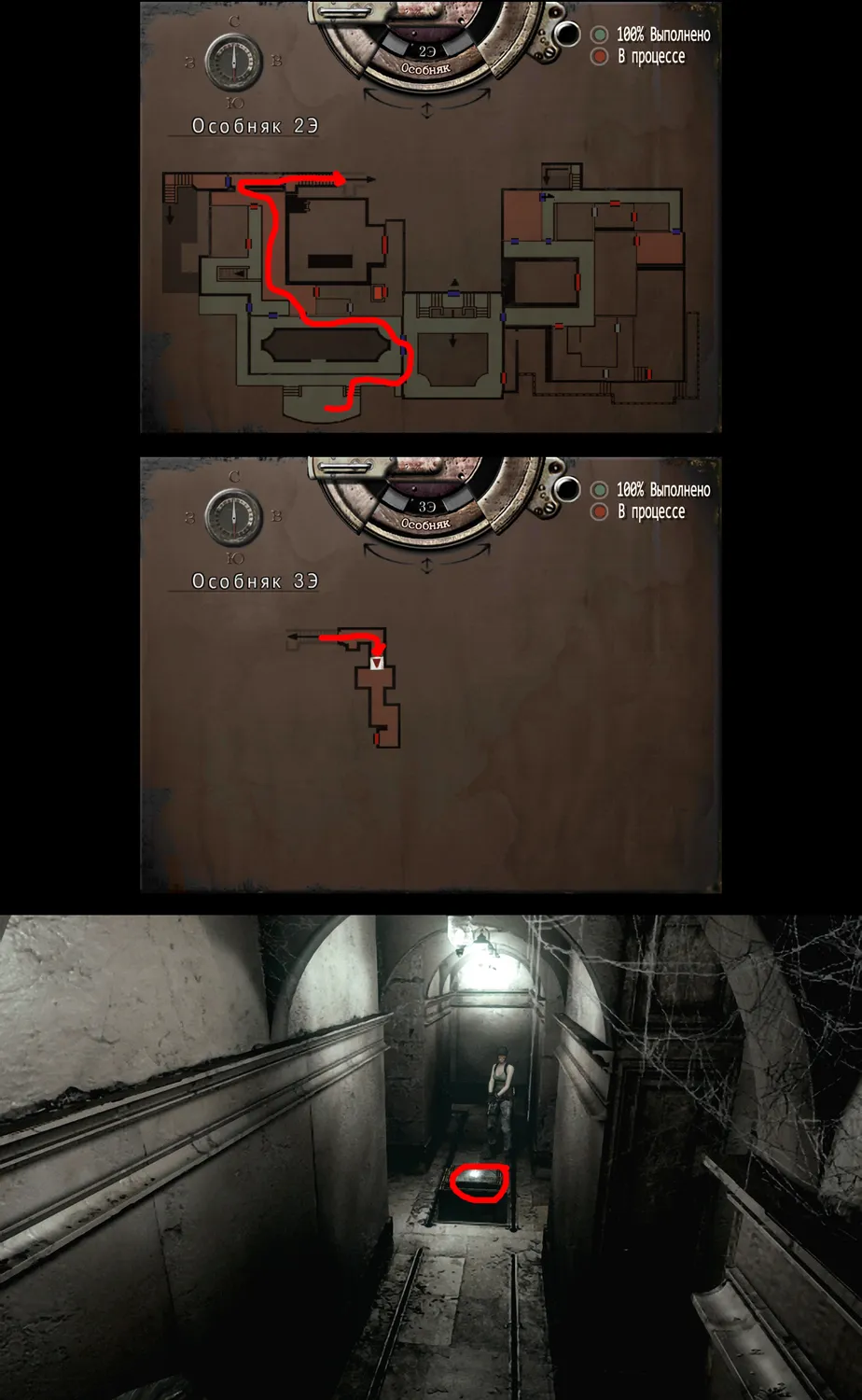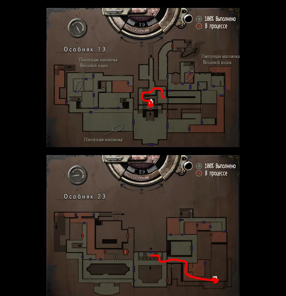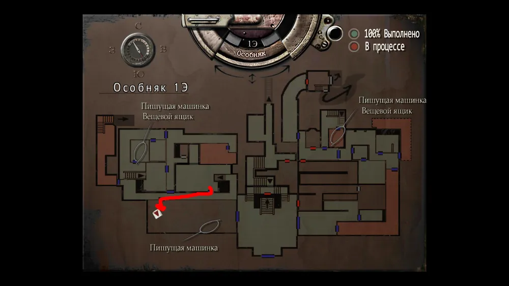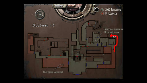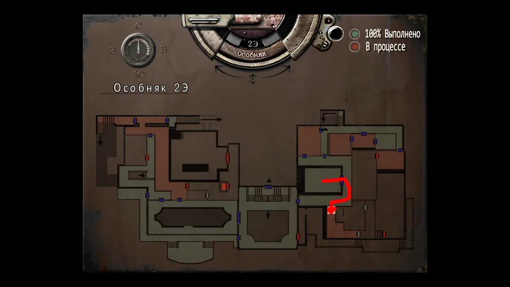 Выйдите из комнаты, поверните направо. Там будет помеченная на карте красным дверь. Откройте ее изнутри и выходите в коридор. Сразу напротив зайдите в столовую и пройдите ее насквозь. Снова зайдите в комнату с каменной бабой и фотографиями и откройте там дверь. Вы в знакомом длиннющем коридоре, только теперь тут врагов добавилось. Дойдите до конца и выходите из него. Далее насчитайте третью дверь (ну или просто предпоследнюю, о которой я говорил ранее) и зайдите в квадратное помещение. Там будет еще одна дверь, заходите.