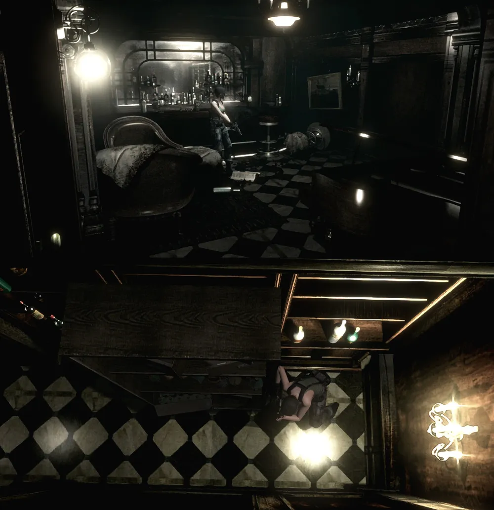 Оббегаем тело и входим во вторую дверь слева. Мы попали в банкетный зал, где есть рояль и много алкоголя. Пить, к сожалению, времени нет, хотя лично я бы был ужрат в хламинад после всего перенесенного бедняжкой Джилл. Оббегаем рояль слева и оказываемся в небольшом барном закутке. Там есть шкаф. Сдвиньте его и возьмите ноты, что за ним. Увы ноты пока не полные, так что уходим отсюда.