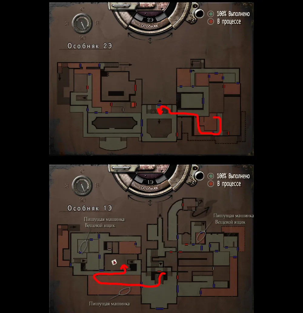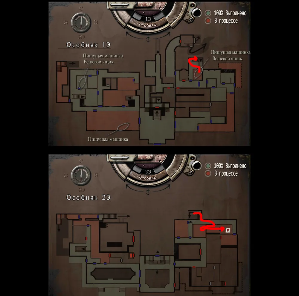 В таких комнатах всегда есть масса полезных вещей: патроны, аптечки, канистры с керосином, печатные машинки для сохранений, а также чудо-ящики, которые хранят все ваши ненужные вещи и телепортируют их от одного ящика к другому. Тут пока можно оставить деревянную эмблему, что вы взяли из столовой над камином и голубой кристалл. Так же можно оставить лишнюю траву, лишние патроны, и лишнюю ленту для печатных машинок и нож, особенно если вы нашли много патронов для пистолета. В этой комнате можно взять фляжку, в которую можно набрать топлива из канистры, чтобы жечь трупы. Перед ящиком можно найти инструкцию по сжиганию. Сжигать НЕ обязательно, так что можете просто кинуть фляжку в ящик, чтобы не мозолила глаза.