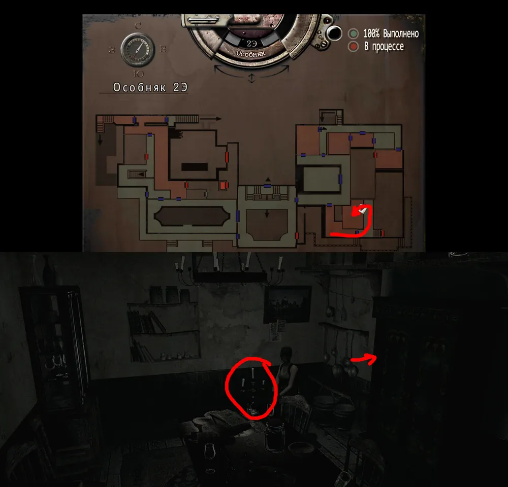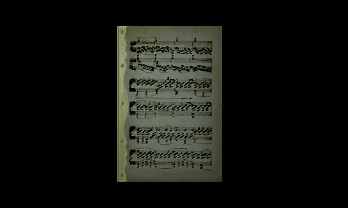 Вылечив солдата или прочитав по нему заупокойную, заходим в единственную дверь в конце этого помещения, а потом поворачиваем налево. Там в конце будет не запертая дверь, так что заходим в нее. Тут будет очень темно, поэтому перво-наперво зажгите зажигалкой свечи на столе, а потом отодвиньте шкаф. За ним окажется тайная комната, где лежит недостающий нам кусок нот.