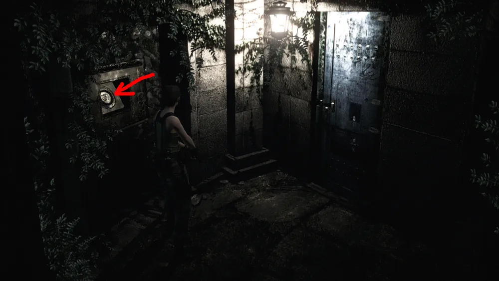 К этому моменту, если вы собирали вообще все, у вас уже скорее всего забьется инвентарь. Если такая неловкость произошла, то выходите обратно на лестницу и на площадке между двумя этажами зайдите в неприметную дверь. Вы окажитесь на улице. Бегите до конца, туда, где находится очень крутой склеп. Тыкайте по нему кнопкой «Действие» и Джилл покажет, что в верхней секции есть пазух для наконечника стрелы. Вставляем его и откроется проход.