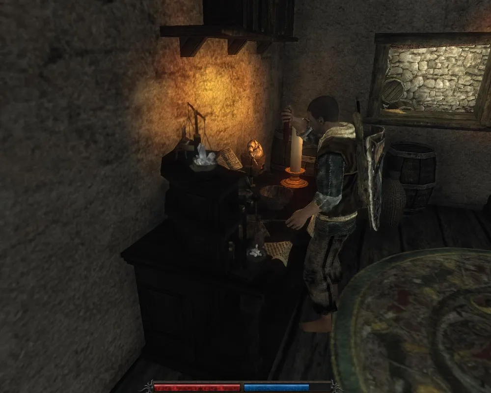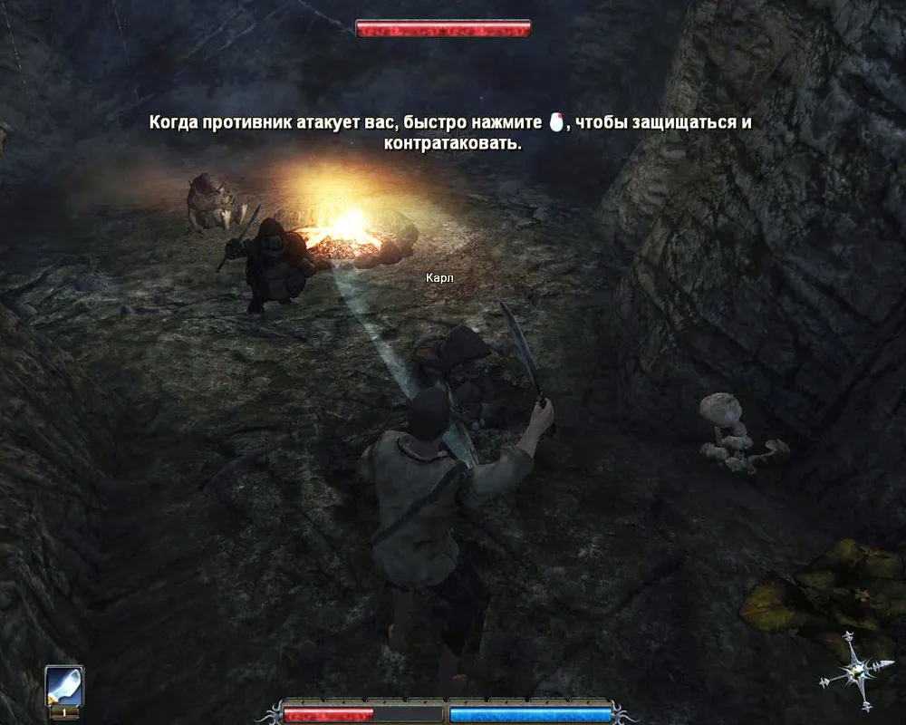 Внутри темно, вытаскиваю припасенный факл. Эффекты огня страшны и не технологичны, но зато стало светлее. Вижу рудную жилу — сейчас она бесполезна, добывать не умею. Стоп, я вообще ничего не умею. Экран навыков и статистики показывает абсолютно пустые ячейки. Мой персонаж в равной степени бездарен во всем. Тем не менее, пока волки и грифы дохнут со свистом. Карлы, обитающие в пещере, мрут не так оперативно, но тоже не особо сопротивляются. Подземный путь выводит меня обратно на побережье — как же я не заметил вход? А тут еще и вкусности лежат. Инвентарь медленно набивается всяким — деньги, снадобья, еда, оружие. Предвкушаю, как все это продам. Первое требование к ролевой игре, можно сказать, выполнено на ура — различных предметов много и лежат они на каждом шагу. Коллекционер радуется, как дитя. Тут цветочек, тут кто-то умер, тут кого-то убили, а здесь вот грибок, а там, за холмиком, лечебный кустарник и два мертвых путника…