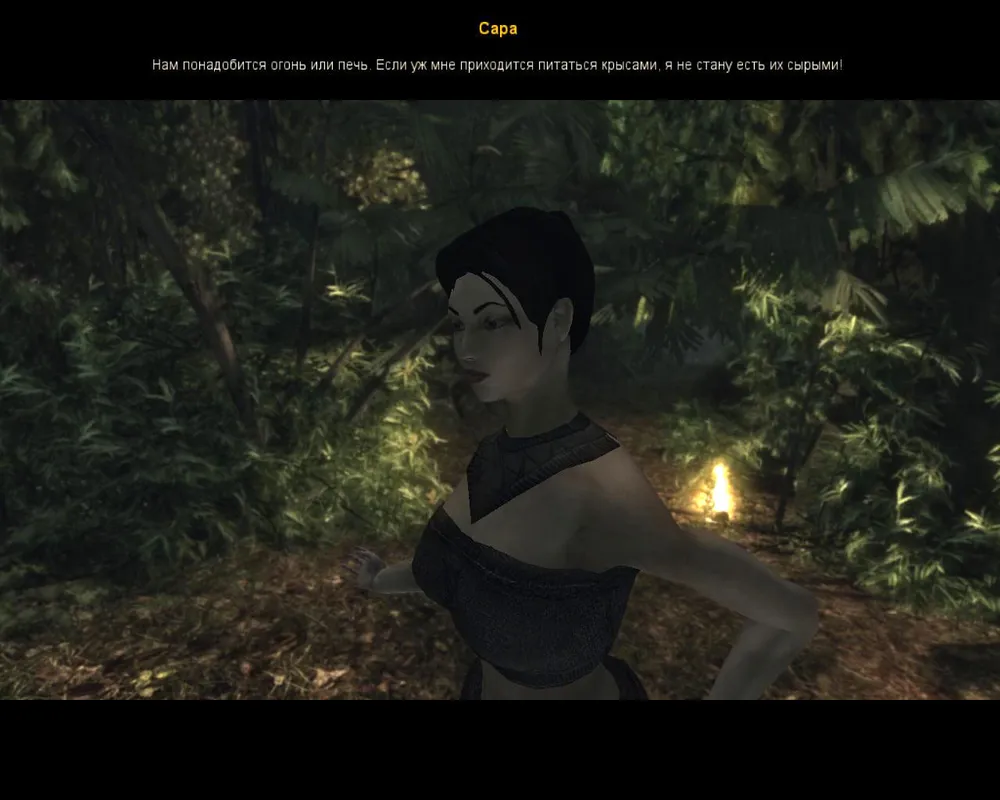 Среди плохих пловцов обнаружил девочку. Звать Сара — буфера, что надо. Говорит, тоже не помнит ни черта, но считает, что в глубине острова должны быть люди. Берег я все равно обчистил, поэтому ее идея не кажется мне новой. Мы двинулись в джунгли. Красиво, ничего не скажешь. Анимация моих движений, конечно убога, монстры тоже не отличаются грациозностью, а уж на лицо страшны мы все. Вот если откинуть неказистость, что бросается в глаза, как дикий кабан, то окружение очень качественно выполняет свою задачу. Я вижу простой куст — сразу хочу поискать там что-то интересное. Возможно, тайник какой-то, а то и запрятанный сундучок или еще что-то такое. Ровно посередине этой мысли я увидел пещеру.