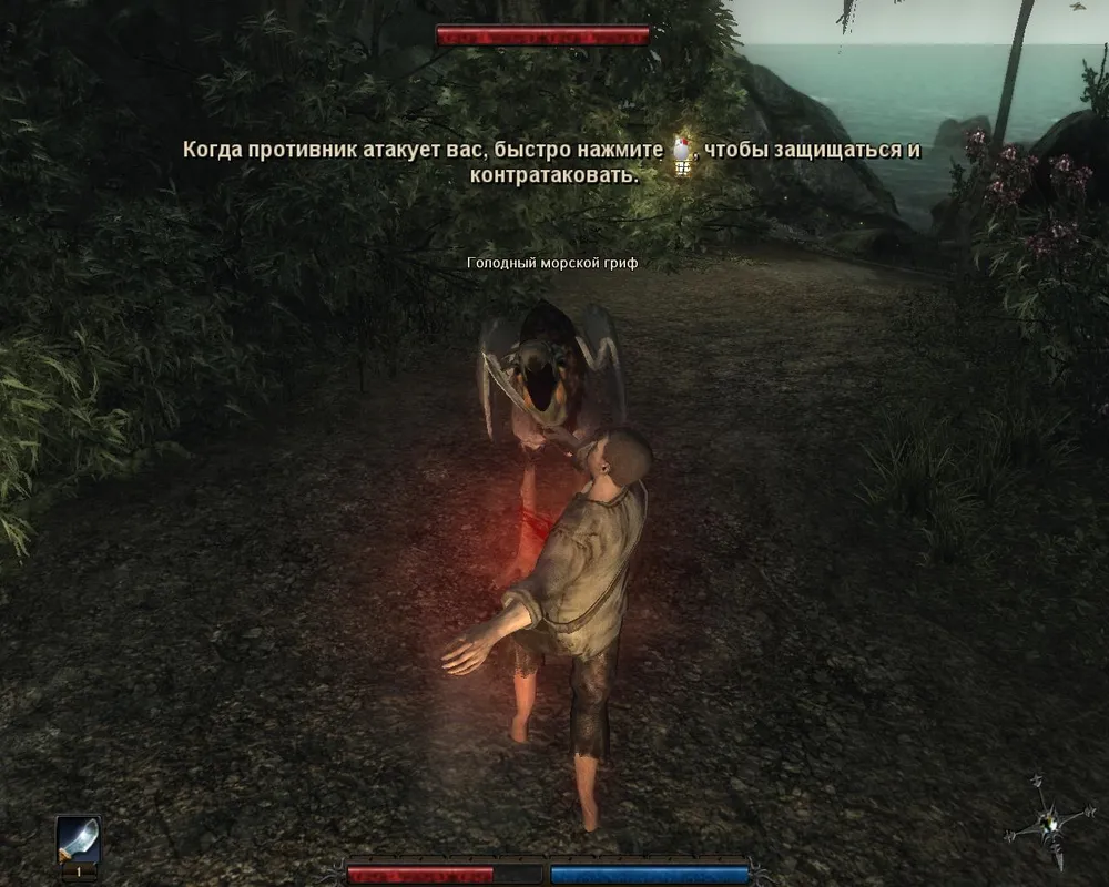 Сзади море, вокруг джунгли. Чувствую скрытую угрозу. На берегу валяется какая-то палка, пока возьму ее. Голой пяткой лезть на дикого зверя, мягко говоря, вредно для «хитпоинтов». Прогуляюсь-ка по берегу. «Готика» всегда славилась обилием дикорастущих ништяков, их можно заготавливать сотнями, а потом вкусно хрустеть после тяжких боев. Действительно, чутье меня не обмануло — кроме различных полезных цветов, я нашел еще и свежевыброшенных на берег морячков. У одного в кармане оказался охотничий нож, всяко лучше, чем палка. Уже чувствую себя настоящим героем. Когда возвращался назад, встретил первого монстра. Какая-то огромная птица выпрыгнула из-за куста, в штанах потеплело, глаза загорелись огнем, в три удара я расправился с каргой и отломил у нее ножку — на ужин будет курятина. Или что это за тварь?
