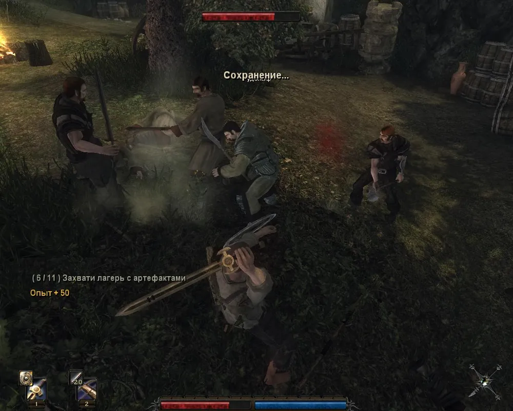 Почему-то решился пойти к Дону. Воровать люблю, наверное. Сразу вспомнилось, как в «Готике 3» обносил дома. «Стану олигархом» — подумалось мне. Ян повел на болота, набежали волки, сожрали в три удара. Загрузка. Убегаю от волков, уворачиваюсь от кабанов, десятой дорогой обхожу шипастых крыс. Монстры, хоть внешне и не изменились, но, видимо, подросли внутренне. Дают «лещей» радушно и щедро. Кое-как добрались до лагеря. Народу тут полно, с ходу охотник дает задание — расправиться с червем. Что-то такое уже было… Вдвоем мы щекочем огромное чудовище насмерть, я выполняю первое настоящее задание. Радовался так, что получил уровень. По старой традиции, видимо, очки распределять самому нельзя… ладно, поищем тренера.