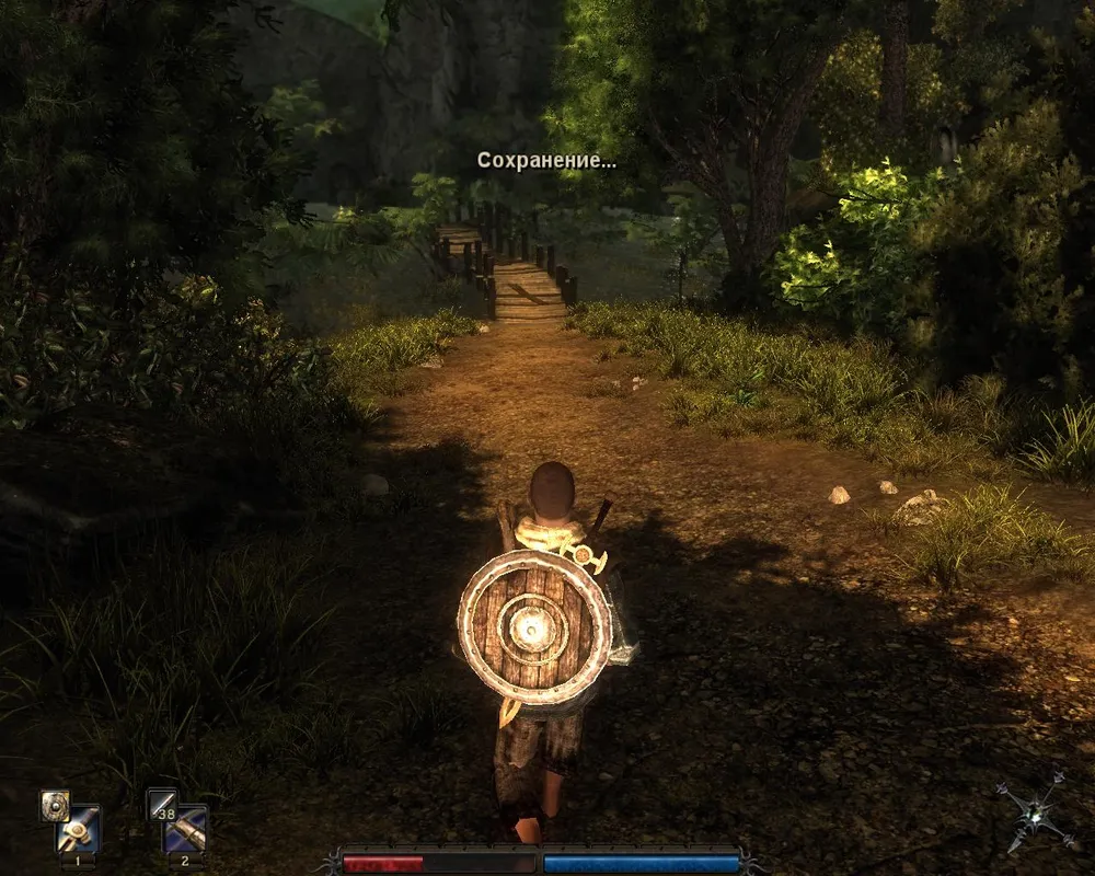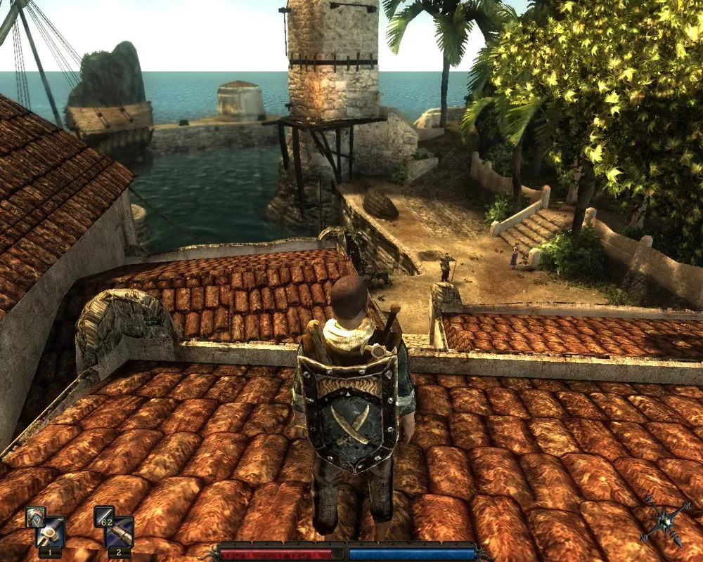 Трупам как-то не удивляюсь. Особенно если они богаты хоть чем-нибудь. И вот — первая встреча. Мужичок Ян с округлившимися глазами предупреждает, что в округе монстры какие-то шастают кусачие. Взялись они из храмов, что неожиданно вылезли из под земли, словно грибы. Внутри этих непонятных святилищ нашлись десятки золотых, дорогих и вообще волшебных вещей. Этим тут же заинтересовалась Инквизиция. Они захватили город, выкинули оттуда местного главаря Дона Эстебана, взяли Монастырь магов под контроль и теперь копают артефакты, где только могут. Прямо в начале игры Ян предлагает нам выбрать прохождение — пойдем в Монастырь, там нас лишат свободы воли, но научат магии. В городе забривают в монахи — учат ставить шишки посохом. На болотах живут коварные бандиты во главе с Доном. Там предпочитают мечи, скрытное передвижение, взлом и воровство. Мне стало грустно — выбирать нужно раз и навсегда. Монахов не берут в разбойники, а в послушников Монастыря принуждают заниматься магией. Иными словами, в игре есть три фракции, но примкнуть можно только к одной. В награду мы получаем какие-то особенные навыки. Так монахи никогда не смогут искусно воровать, а охотнику Дона не судьба обучиться колдовству. Ничего не напоминает?..