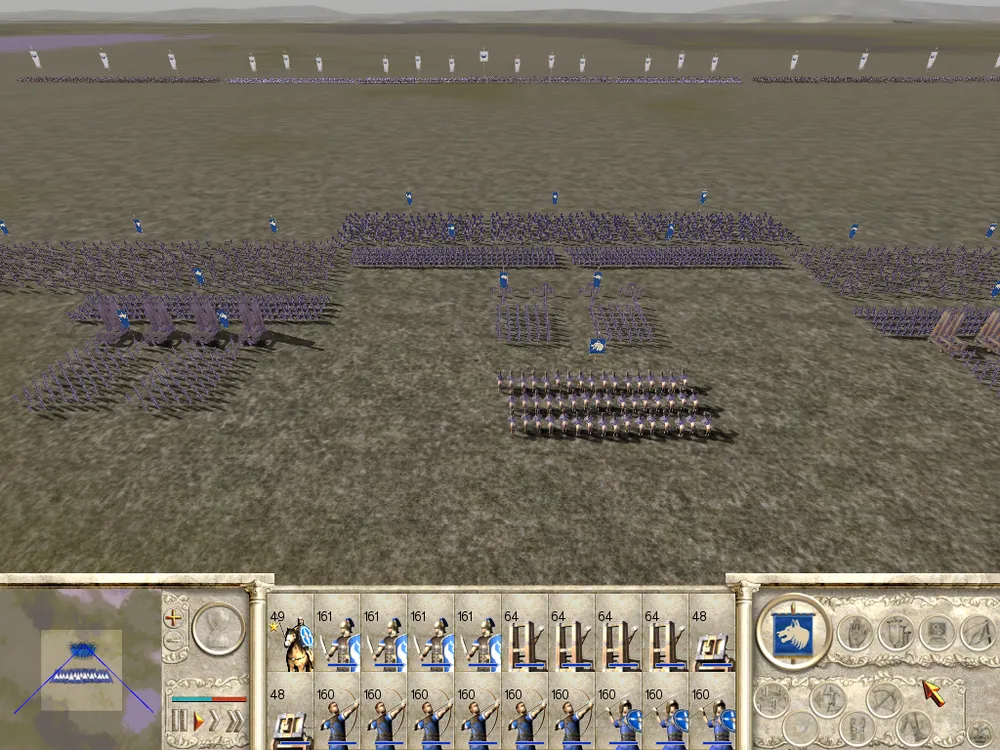 Первое построение – одна линия. Вся армия вперемешку растягивается от горизонта до горизонта. Отряды становятся следующим образом (слева направо): генерал, пехота, лучники-велиты, конница. В различных описаниях и туториалах к игре написано, что такое построение пугает врага и он, видя, насколько много солдат у противника, убегает с поля боя. Но, растянутая таким образом, армия терпит самые обидные поражения. Так получается из-за того, что юниты, выполняющие разные функции на поле боя, стоят не там, где они были бы полезнее всего: пехота – в центре, кавалерия – по флангам, лучники – сзади и генерал – по центру сзади. Согласитесь, ставить генерала на край левого фланга, где он уязвимей всего, просто безрассудно. А зачем нам столько кавалерии справа? Когда левый фланг будут осаждать вражеские кавалерия и лучники, пехоте и генералу придётся самим с ними справляться. Генерал может погибнуть и пехота из-за этого станет ещё более уязвимой и запаникует, когда её атакуют. «Одна линия» очень удобна, когда надо построить несколько отрядов одного типа в линию, чтобы не делать это вручную. Но производить такие манипуляции со всей армией – самоубийство. Тем более, растянутая армия банально не помещается на карте.