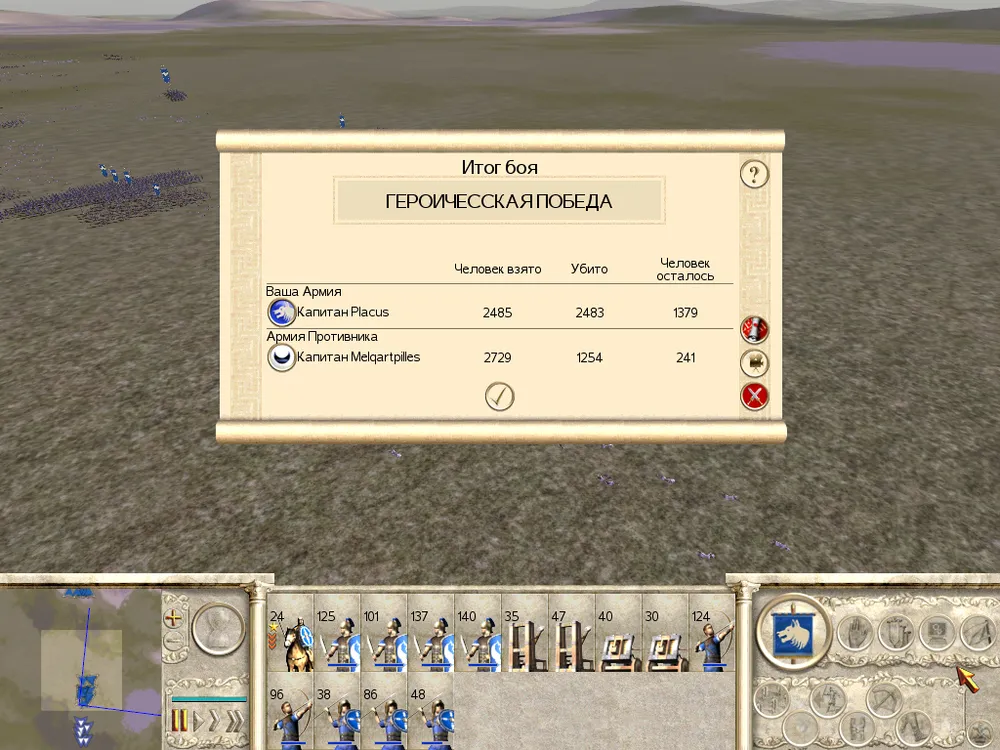 В девяти случаях из десяти вражеский генерал летит вперёд на велитов и, не зная, что с ними делать, получает по башке снарядами, брошенными в него велитами и принципами, только этого и ждущими. Постояв перед ними без толку, он, всё-таки, панически отступает. Онагры и баллисты уже давно ведут относительно прицельный огонь по приближающейся пехоте врага, а лучники поливают стрелами вражескую кавалерию, скопившуюся на обоих флангах. Как только пехота врага врежется в строй велитов в центре, враг начнёт действовать и на флангах, атакуя как лучников, так и онагры. Так что теперь нужно переходить к активной фазе боя. Пока в центре идёт неравный бой велитов с пехотой врага, а принципы на флангах стараются не допустить кавалерию до онагров, нужно вводить в бой и генерала. Он поскачет в центр, куда 100% уже давно вернулся вражеский командир. За нашим генералом можно отправить и команду баллист – в ближнем бое от осадных механизмов мало толку. Когда центр отбит и враг побежал, пусть пара отрядов велитов догоняют паникующего врага. Если от пельтастов осталось шиш да маленько, в догонялки с врагом могут поиграть и команды баллист, главное теперь – не позволить врагу реорганизоваться, ведь все уже устали и второго натиска врага точно не выдержат. Теперь генерал должен спешить на помощь своим флангам, которые ведут неравный бой с превосходящими силами вражеской кавалерии. Когда кавалерия побежала, оставьте её в покое – всё равно её догонять некому. Теперь генерала, да и вообще всю армию вместе с командами онагров, нужно отправить вперёд, на помощь отрядам баллист, на которых напал оправившийся от поражения враг. Вот когда нужно использовать одну единственную тактику, которую многие так любят – навалиться толпой, чтобы враг бежал в панике и уже не возвращался назад.