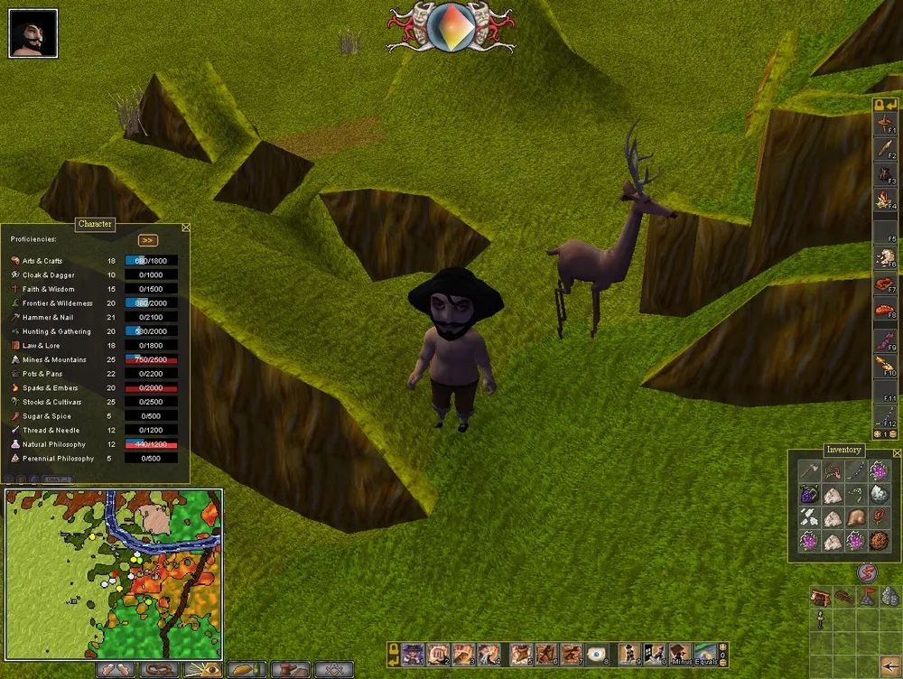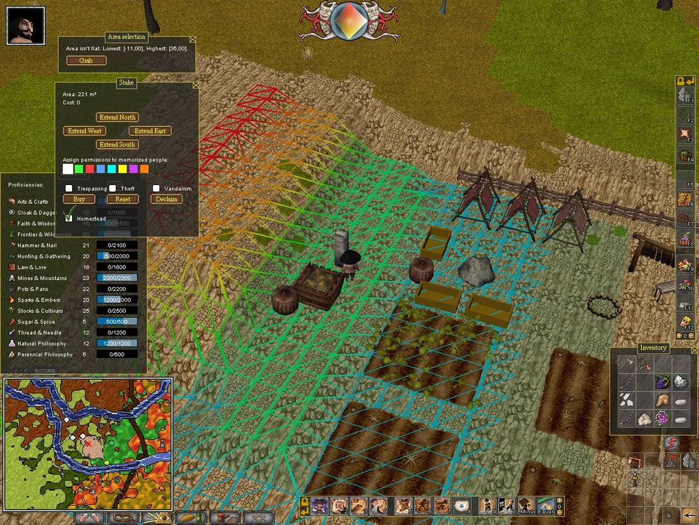 За неимением лучшего инструмента, копка грунта отнимает большой запас пищи, но в округе полным полно ягод, к тому же вылазки за съестными припасами всегда удачны на всяческие предметы для изучения навыков. Таким образом копая землю,одновременно поднимал фермерские, поварские, охотничьи, строительные способности . Купив лицензию претендента на участок, далее я совершил глупость о которой жалею сейчас. Мой столбик от которого начинаются права владения поместьем, и приобретаются новые клетки, расположен в крайней близости к почти отвесной стене на отдельной от поля возвышенности. Чтоб окружить этот монумент ограждением мне потребуется снести огромное количество почти отвесного склона горы , так как деревянный забор просто не хочет возводиться ни под каким наклоном земли =))). Таким образом планирование поселка террасами отпадает.