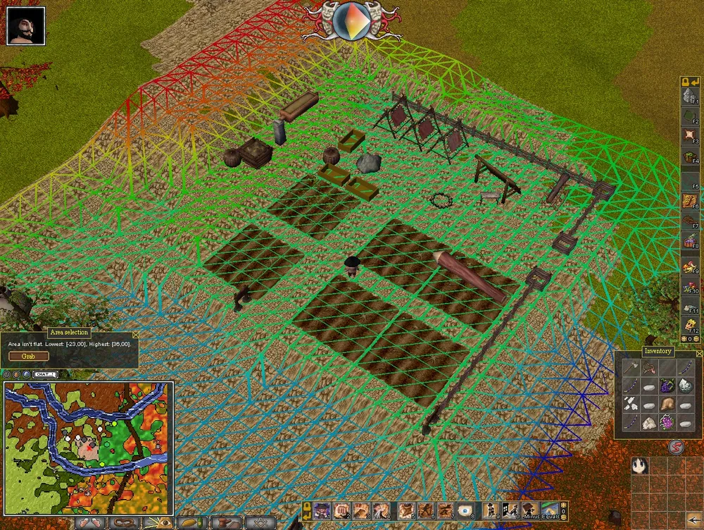 Осмотревшись по сторонам вокруг первого лагеря было выбрано новое место проживания. Новый лагерь расположился недалеко от устья двух рек на склоне. На первый взгляд зеленые поля , при рассмотрении по ландшафтной сетке через новый UI, оказались холмистой местностью с приличными перепадами высот. Идея создания поселения сразу на нескольких уровнях грунта привлекла с самого начала и выучив навык Labouring, который уменьшает затраты флегмы на копание, я принялся выравнивать почву деревянной лопаткой...