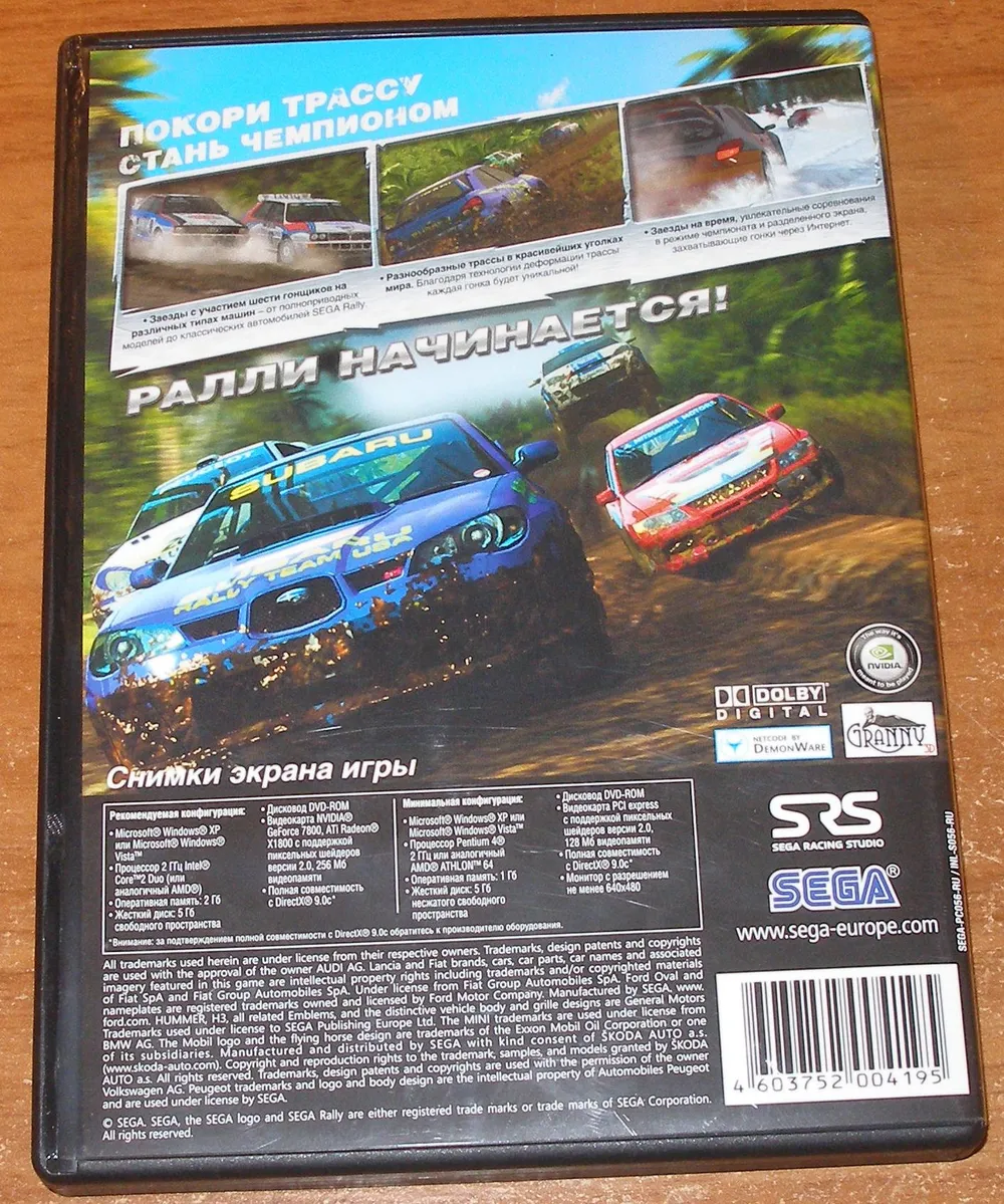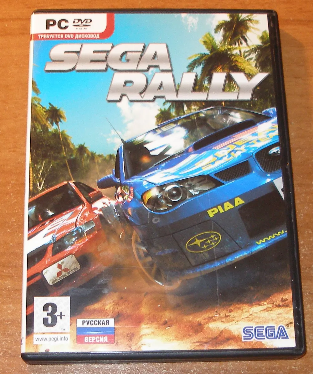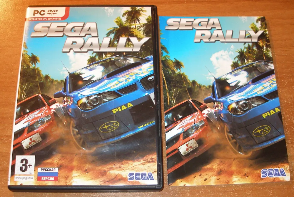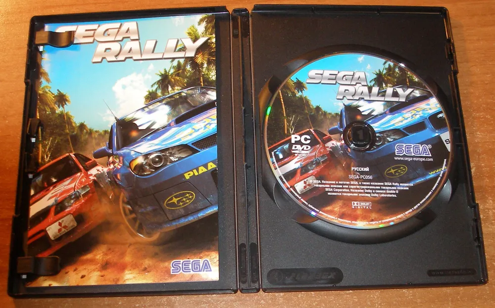 Обзор DVD-Box'a игры SEGA Rally: содержимое включает диск и буклет-руководство. Игра предлагает приятный геймплей, но требует подключения руля или геймпада и установки патча для комфортной игры.