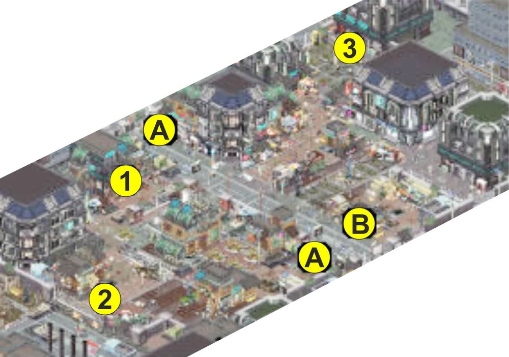 А – вход в метро. 1 – убежище. 2 – Дитрих. 3 – Глори. В – вход в канализацию.