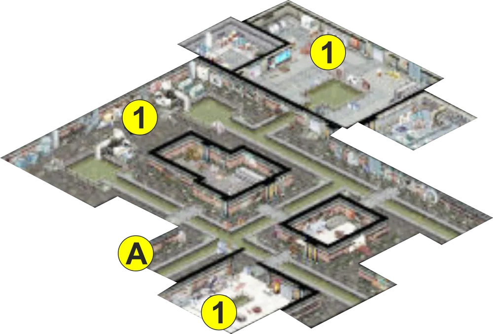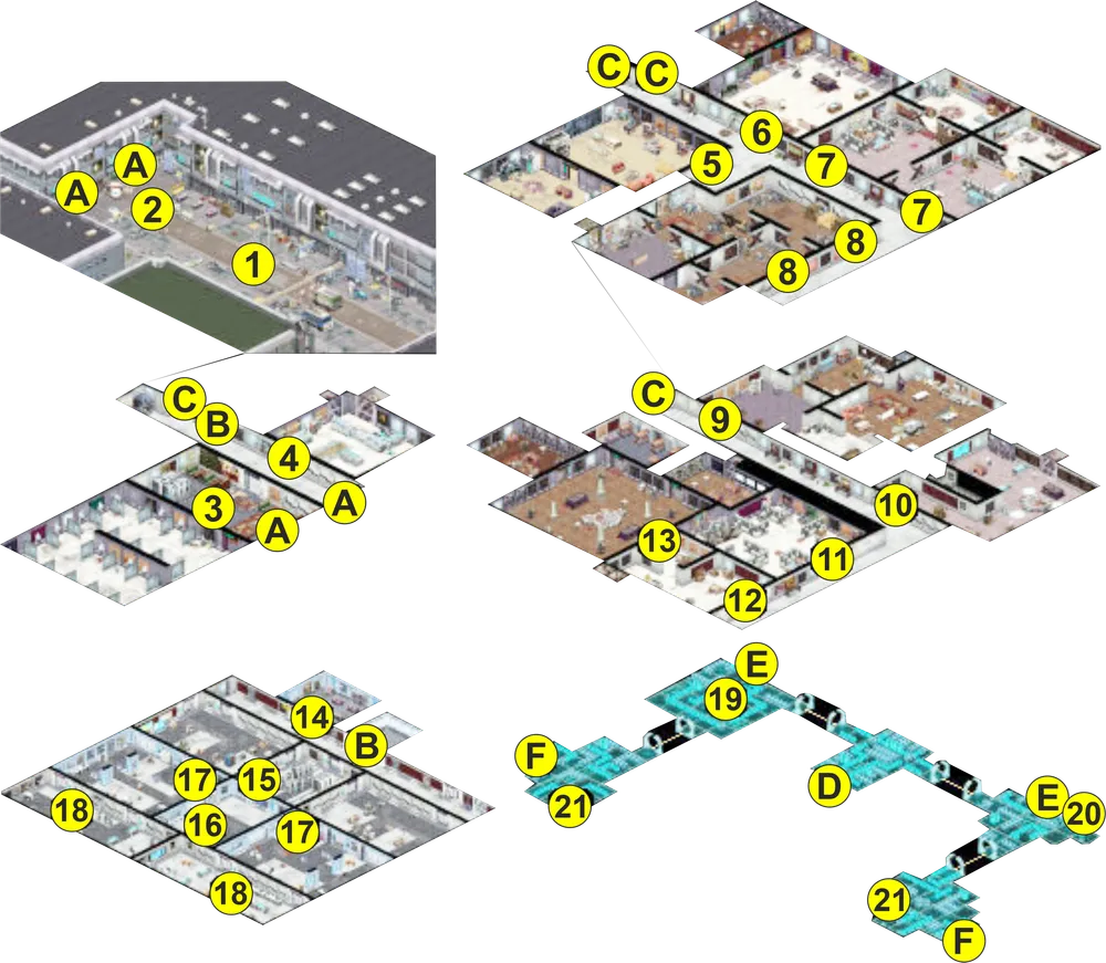 1 – начало миссии. 2 – Ульрих. А – парадный вход/выход. 3 – Парсон. 4 – торговец Карл. С – лестница. 5 – квартира Джанет. 6 – жилище магнификеров. 7 – апартаменты Хаба. 8 – жилье металюдей. 9 – квартира Франца. 10 – жилище магнификеров. 11 – апартаменты Хаба. 12 – заброшенная квартира. 13 – убежище Тритемия. В – лифт. 14 – арсенал Работников. 15 – центральное помещение. 16 – главный терминал ИИ. 17 – терминал управления турелями. 18 – вторичный терминал управления ИИ. D, E, F – выход из матрицы. 19 – узел управления западными турелями. 20 – узел управления восточными турелями. 21 – узел управления контрольными подпрограммами.