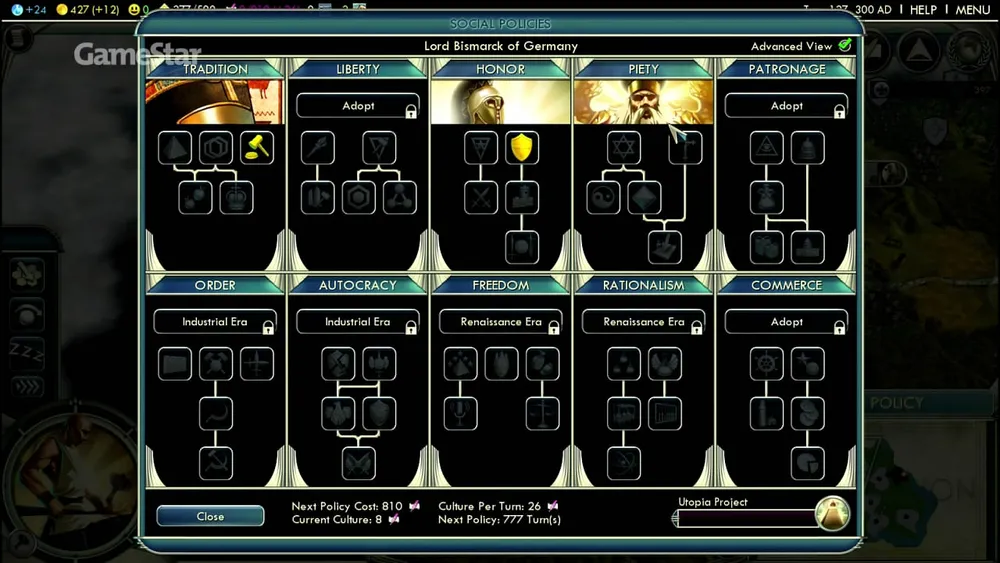 Новая система управления стала проще. По мере накопления очков культуры (которые дают здания, например Храмы), мы не только расширяем границы, но и получаем доступ к социальным строям. Всякий раз можно выбрать, ступить ли на новый путь (к примеру, «порядок» или «традиции») или углубиться в уже существующий. Каждый строй имеет свои преимущества, например «набожность» делает наших горожан счастливее. Некоторые направления не сочетаются, так, наше государство не может быть одновременно «монархическим» и «равноправным». К сожалению, теперь нельзя менять социальный строй – единожды установленная религиозная диктатура останется на века. Социальные конструкторы из Civ4 и, особенно, из «Альфы Центавра» были гораздо гибче и поэтому привлекательнее.