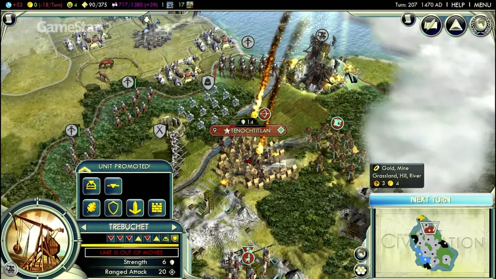 Важнейшее нововведение в Civilization 5 – конечно, не гексагональный ландшафт, а боевая система. Как и в классических пошаговых стратегиях а ля Panzer General, на одном тайле может находиться только один юнит. Стеки канули в небытие. Это добавляет тактическую составляющую, так как мы впервые в истории серии вынуждены задумываться о расстановке нашей армии.
