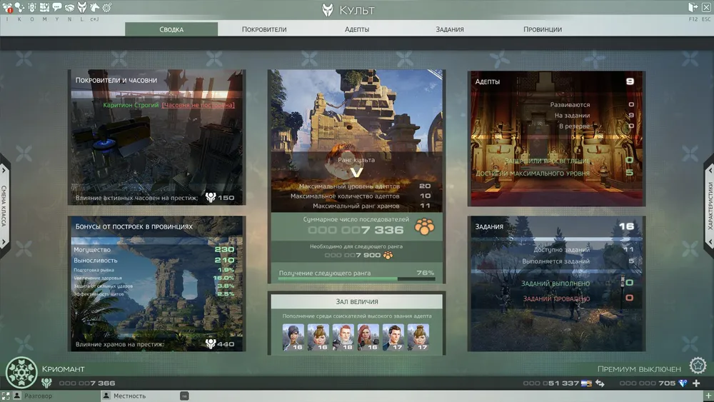 + Свой культ и адепты. Мне не хотелось бы спойлерить вам сюжет, но кое-что придется все же рассказать. Ваш персонаж - это один из множества богов, защищающих этот мир. И так как богом он стал недавно, то и развивать свою "религию" вам придется с нуля. В какой-то момент в игре, вы узнаете, что у вас есть поклонники, которые захотели создать свой собственный культ и помогать вам. После чего у вас возникает возможность посылать набранных вами адептов на разнообразные задания, приносящие вам определенные ресурсы, а так же новых поклонников. Порой, приходится обращаться за помощью к адептам и по сюжетной линии игры. Так же, у вас появляется возможность строить храмы, приносящие определенные бонусы вашему персонажу.