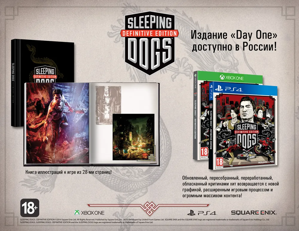 Издание "Day One" игры Sleeping Dogs: Definitive Edition доступно в России! Специальные диджипаки с книгами иллюстраций для Xbox One и PS4 по 2599 рублей, версия для PC за 599 рублей.