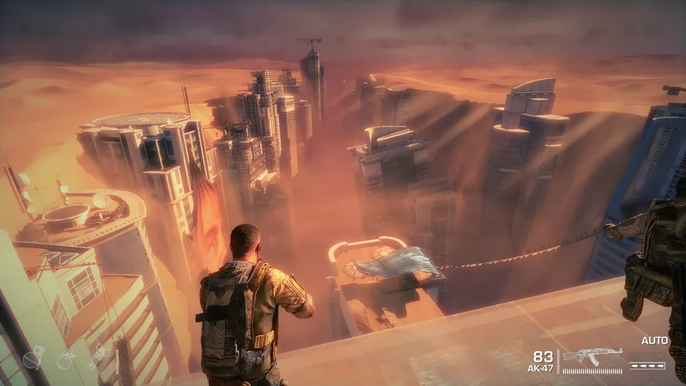 С первых кадров нам дают понять, что это шутер с амбициями — в начале вам дают разнести с десяток вертолётов из бортового минигана, а после этого показывают пафосные ролики о «смерти» Дубая, как города. Занесённые песком улицы города, трупы в машинах, бандиты в банданах, с АК наперевес — всё направлено на создание атмосферы.