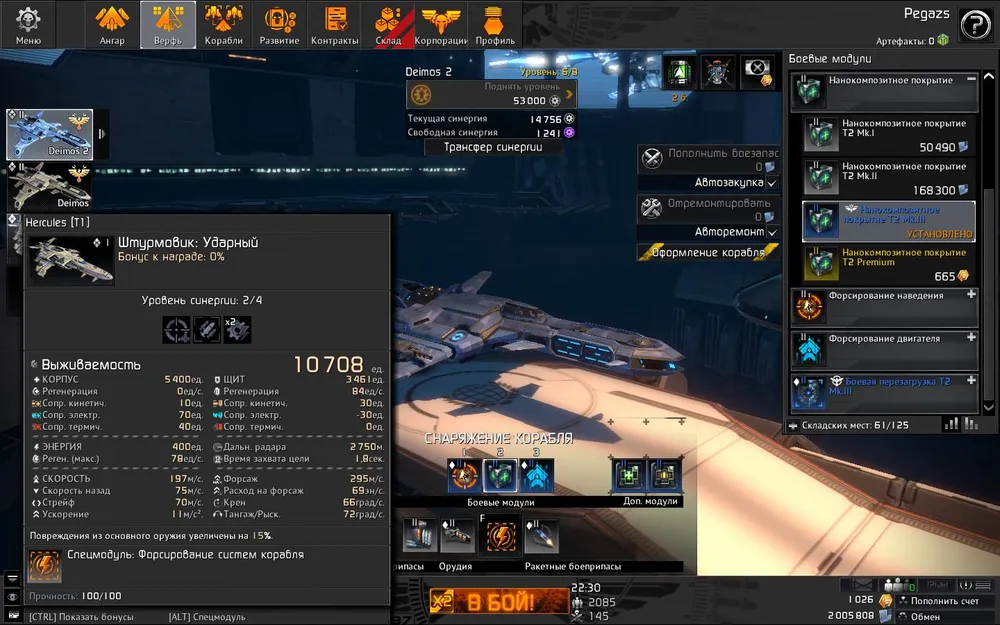 Неизбежное следствие помешательства игры на модулях — необходимость проводить в ангаре определённую часть времени. Не экипированный корабль в общем и целом здесь даже не бесполезен, а просто бессмысленен.