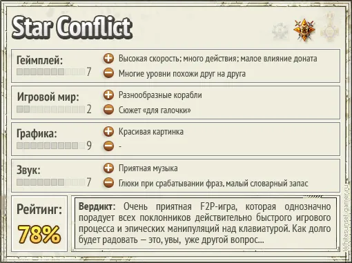 Star Conflict всё ещё шатает во все стороны из-за статуса беты, но, судя по номеру версии, она уже приближается к своему релизному виду. Уже сейчас, впрочем, в ней есть главное — динамичность. Пусть всё ещё с небольшими дырами в балансе и некоторым однообразием, зато про космос, «сделано в России» и весело. Если в Тетрисе вы всегда пользовались кнопкой «вниз», то вам определённо сто́ит присмотреться к Star Conflict повнимательнее.