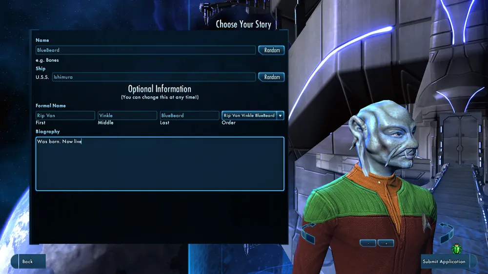 После вы вибираете имя, название корабля, официальное имя и если хватит терпения есть возможность написать себе биографию