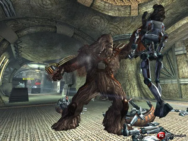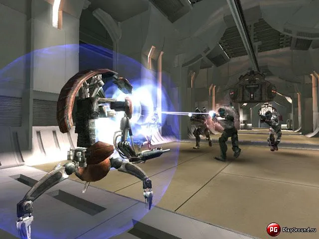 Интерьеры, к слову, поражают своей скупостью. Конечно, можно развернуть дебаты, что коридоры на боевых кораблях Торговой Федерации было не принято украшать фетишистской утварью, а горы Геонозиса – обломками и трупам (таковые имеются, но по большей части на ситуацию с окружением не влияют). Всё же – картина довольно удручающая. Не совсем понятно, куда ушли ресурсы не самого слабого моторчика Unreal Engine 2.0: страдающие дефицитом полигонов модели дроидов обтянуты к тому же мутными текстурами, что делает их больше похожими на буратин. Сочные спецэффекты, пылающие во время ожесточенных схваток, затейливый бамп-мэппинг, ну и, конечно, непрерывная поставка все новых и новых оппонентов – все это призвано скрыть главную «находку» девелоперов – катастрофическую малополигональность. Таким симптомом, кстати, здесь может похвастаться практически любой объект, за исключением разве что главных персонажей игры.