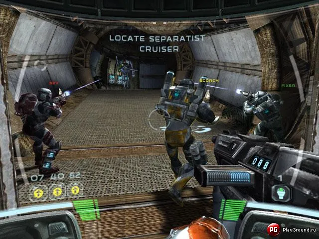 Собственно, ради четверых бойцов Республики все и затевалось. В стройные ряды очаровательных белоснежных штурмовиков не влюбиться практически невозможно – форма, почему-то напоминающая парадно-выходную одежку солдат Третьего Рейха плюс трогательный английский акцент делают просто невероятные вещи с сердцем бывшего пионера. Ваши подопечные из Star Wars: Republic Commando, правда, отличаются от тех, которых вы наблюдали в кино, а потом самозабвенно резали лазерной саблей в Jedi Outcast 2. Во-первых, каждый из ваших коллег оснащен своим персональным цветом – зелененьким, желтеньким и красненьким. Во-вторых, специализацией.