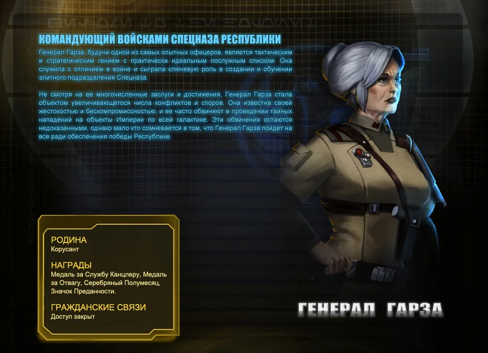 Генерал Гарза, будучи одной из самых опытных офицеров, является тактическим и стратегическим гением с практически идеальным послужным списком. Она служила с отличием в войне и сыграла ключевую роль в создании и обучении элитного подразделения Спецназа.