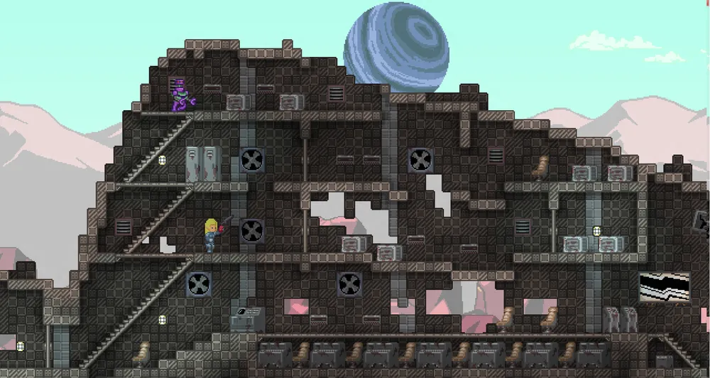 Упавший космический корабль с враждебным роботом на борту. Сразу-то и не понять, что это корабль в разрезе..