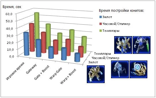 Вы можете оценить эффект применения буста, варп гейтов и их комбинации визуально с помощью этой диаграммы: