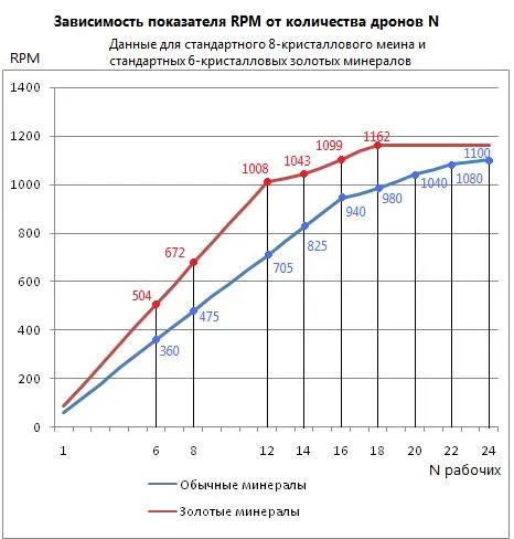 - - 1 проба приносит в среднем 84 минерала в минуту (от 77 до 91 минералов: 11-13 ходок по 7 минералов). Все расчеты для обычных минералов могут применяться и для золотых, т.е. при N меньше или равно 2*K RPM~84*N. При N>2*K эффективность каждого последующего рабочего нестабильна, однако 2*К+1-й и 2-й рабочие, как правило, чуть более эффективны, чем на обычных нычках, из-за того, что «дальних» кристаллов на золотых минералах почти всегда не больше трех.