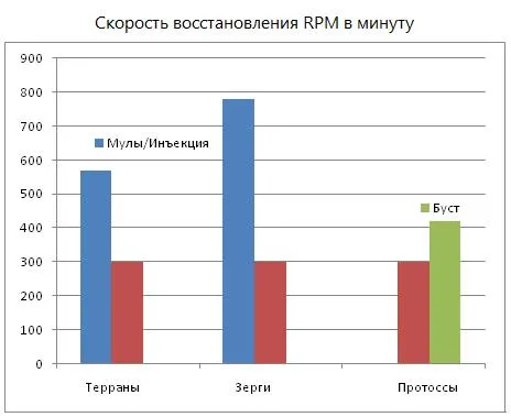 Как могут восстанавливать экономику терраны? В течении одной минуты они построят 60/(17*3/4)=~5 рабочих и вызовут одного мула. Это увеличит RPM террана на 60*5+270=570 минералов в минуту. Зерги без инъекции смогут вызвать тех же 5 рабочих, а с использованием инъекции личинок – 13. Таким образом, они восстановят 13*60=780 RPM. Протоссы без использования буста опять же построят 5 рабочих, а с применением буста ~7, восстановив таким образом 420 единиц RPM. Таким образом, скорость восстановления RPM у протоссов самая медленная (с учетом применения расами их макроспособностей), а значит, протоссам действительно нужно дорожить своими рабочими.