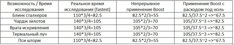 (последний столбик считается следующим образом: мы считаем кол-во полных циклов по 30 секунд реального времени, за которое апгрейд исследуется за 15+15*3/2=37.5 секунд, затем, если у нас осталось больше 15 секунд исследования апгрейда, применяем еще один буст и считаем остаток времени, иначе просто добавляем остаток времени к уже высчитанному)
