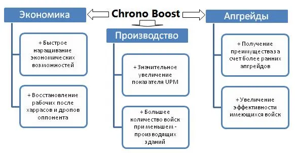 На первый взгляд, макро во втором старкрафте было разбавлено именно такими вот унылыми цикличными действиями: за терранов надо каждую минуту в каждом СС вызывать мула (иначе потеряете в минералах), за зергов надо в каждом хатчери каждые полминуты использовать инъекцию личинок (иначе уменьшится UPM), а за протоссов нужно тыкать этот ненавистный буст куда-нибудь практически каждые 30 секунд, иначе вы опять же начнете проигрывать. Однако, на самом деле, протоссам дали самую «думающую» макроспособность, ведь если терранам и зергам надо просто бездумно нажать пару кнопок, то у протоссов возникает огромный вопрос: а куда именно применять этот самый буст-ускоритель? Использование буста дает тоссам поистине обширные возможности для планирования своей стратегии.